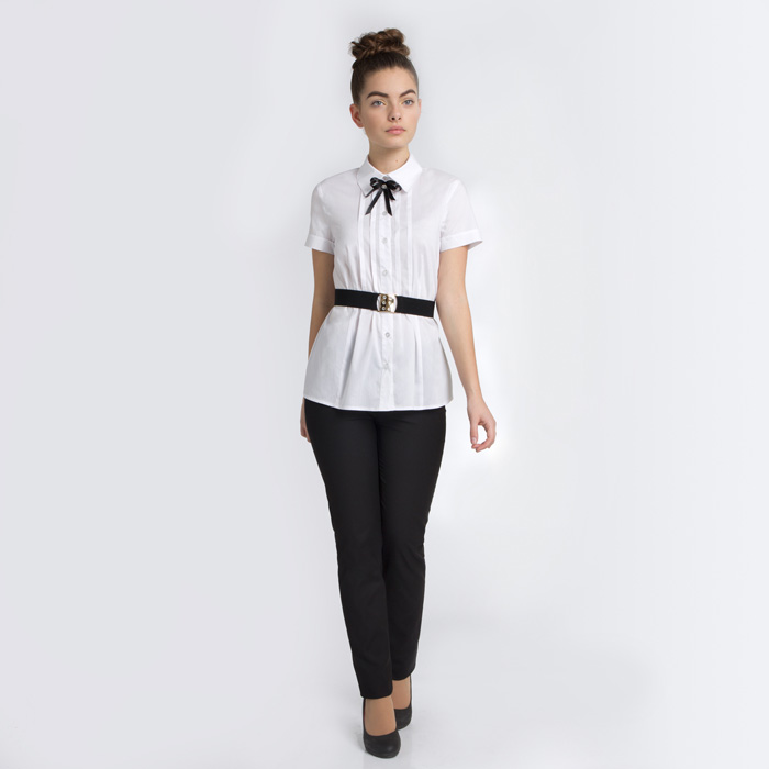 Батник для девочки из текстиля белого цвета. Длина стандартная. Силуэт расширенный. На полочке защипы. Застёжка планка полочек на пуговицы.