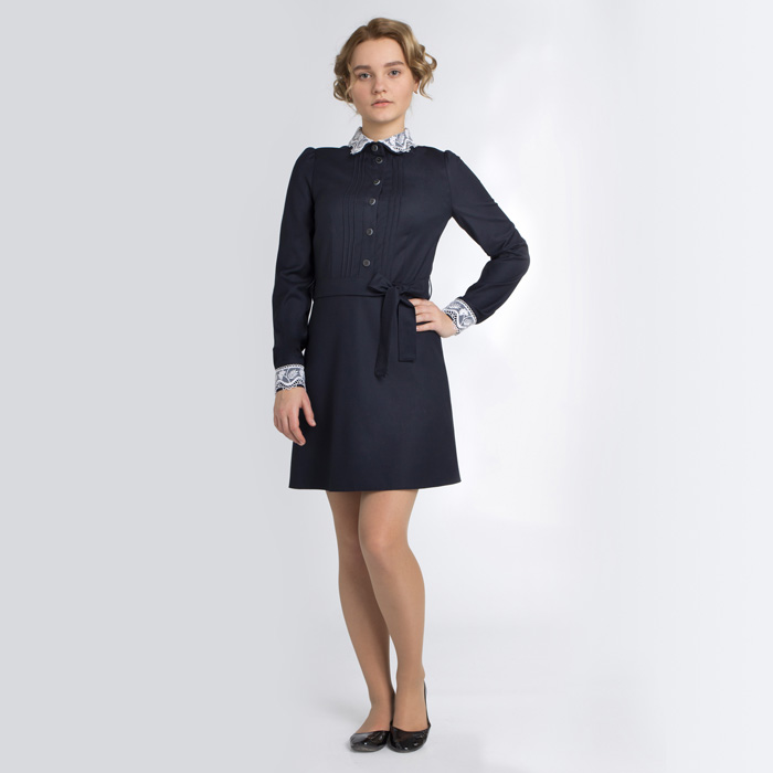 Платье для девочки из текстиля тёмно-синего цвета.Длина на 7см выше линии колена. Силуэт расширенный. Отрезное по талии. Длинный рукав на манжете с пуговицей. Воротник отложной на стойке.Застежка на пуговицы до линии талии. На полочке и спинке талевые вытачки. Платье с поясом