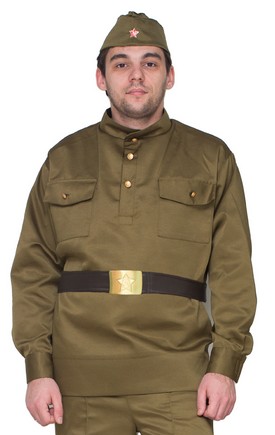 Пилотка, гимнастерка с металлическими пуговымцами со звездой, ремень с бляхой
