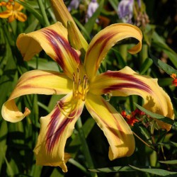 Лилейник гибридный: корневищные травянистые многолетники с мочковатыми мясистыми корнями. Мечевидно-изогнутые листья образуют плотные кусты. Цветки по форме похожи на цветки лилий, крупные, чаще воронковидные, шестираздельные, с небольшой трубкой, собраны по 2-10 в раскидистые соцветия. Каждый цветок живет один день, но множество цветков на взрослом растении обеспечивают длительное цветение. В пасмурную прохладную погоду цветки живут до шести дней. Общая продолжительность цветения куста 25 и более дней. Лилейник один из самых малотребовательных многолетников. Зимостоек, засухоустойчив, жизнестоек. Сохраняет декоративность с весны до глубокой осени. На зиму можно не обрезать, лишь подсыпать к кустам торфокомпост. На одном месте может расти очень долго, образуя крупные, широкие кусты.