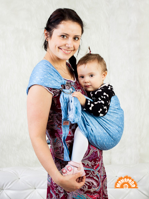 Слинг с кольцами Мамарада удобный - рисунок голубое кружево. Физиолоигчные положения ребенка с рождения и до 2-х лет.