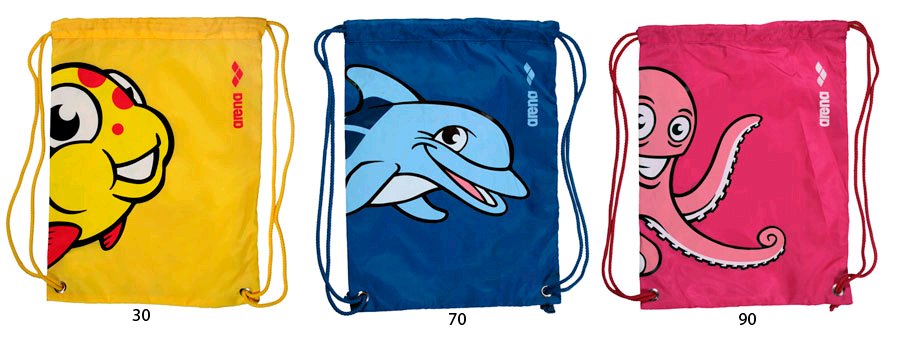 Детский мешок для плавательной экипировки с рисунками морских персонажей. Закрывается с помощью двух шнуров, может использоваться как рюкзак.