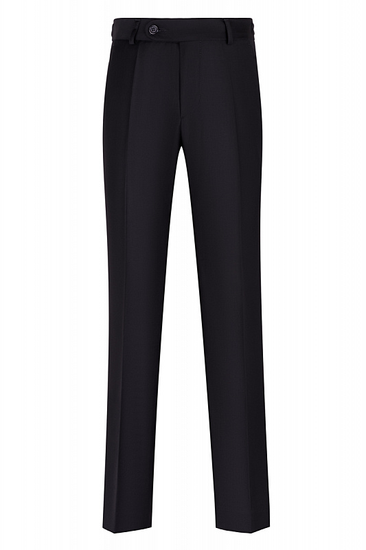 Детские брюки Стенсер классические, немного зауженного силуэта для мальчиков, на вискозной подкладке, ткань верха (Т5198) -плотная черная гладь. Первая цифра маркировки обозначает полуобхват бёдер. Пояс брюк в 34-м размере - 66 см, градация - 3 см.Линия посадки брюк средняя. Пояс застегивается на металлический крючок и пуговицу. пояс с корсажем, для регулировки имеет внешнюю стяжку на пуговицах. На задней части брюк карман "листочка"